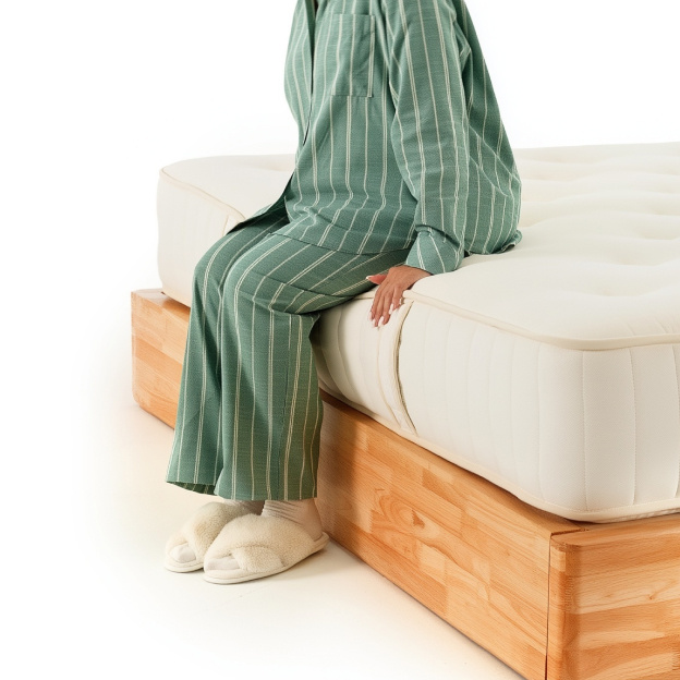 The mattress is encased in Organic Cotton Brushed Twill. This heavyweight fabric is strong enough to hold the structure of the mattress but soft to the touch. After manufacturing, it's brushed and treated in accordance with GOTS requirements to enhance softness without compromising strength.