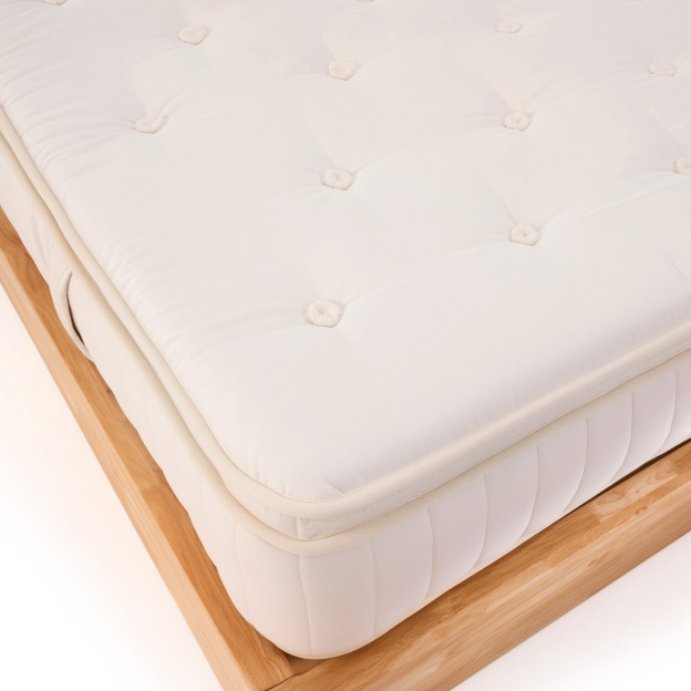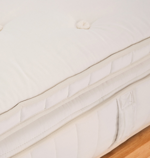 Each mattress is assembled by hand in our Niles, IL factory using premium pocket springs, organically sourced fair-trade latex foam, and natural organic fibers. The mattress is hand-tufted with up to 64 wool rosettes that lock the layers together and create cohesive comfort. Both sides are finished the same, giving you two identical sleeping surfaces you can flip for long-lasting, even comfort.